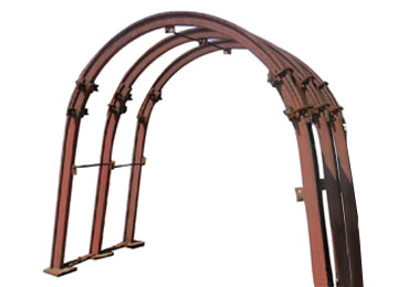 弓棚支架直墻半圓拱支架抬棚在采準巷道交岔點的應用,并取得了顯著的成效. 選用U型鋼可縮性支架,較好解決了掘進支護的難題。U型鋼支架較其他剛性支架具有可縮性和穩(wěn)定可靠的承載能力,適應松軟圍巖的載荷和變形,斷面利用率高,支架支回方便,維修量小,支架回收復用率高,減少坑木使用,環(huán)保效益十分明顯。