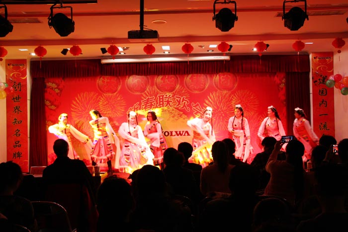 隨后,在激情澎湃的舞蹈《不如跳舞》的開場下,正式拉開了晚會的序幕,各種節(jié)目異彩紛呈。電子商務(wù)部的小品--《新聞晚報(bào)》編排得體、表演到位,風(fēng)趣幽默;德立信液壓公司的火爆中國大江南北的騎馬舞《江南,style》表演后,特別邀請集團(tuán)領(lǐng)導(dǎo)集體上臺表演,把晚會推向了一次高潮,掌聲雷動;工程機(jī)械公司邵鷺揚(yáng)先生《歌曲串燒》,載歌載舞、激情四射,把晚會徹底推向了高潮;集團(tuán)公司的藏族舞—《家園》以其如詩的意蘊(yùn)、動聽的音樂、及絢麗的舞蹈達(dá)到了詩、樂、舞的精彩匯聚,實(shí)乃一場視覺上的盛宴及精神上的享受。董事長楊總一首《驛動的心》更是贏得了現(xiàn)場觀眾的一片掌聲和歡呼。