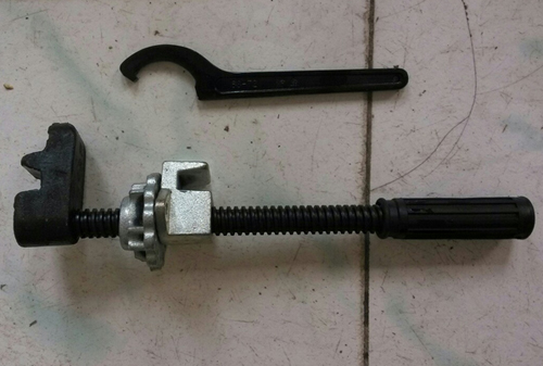 一種由鉤板、絲桿、活動(dòng)鉗口、防護(hù)罩、螺母、套筒扳手、膠木球、手把、凸塊、螺栓和墊圈組成的鐵路線路加鎖道岔用鉤鎖器,如圖1所示。絲桿插進(jìn)鉤扳上部孔中并焊接?;顒?dòng)鉗口與防護(hù)罩焊接。絲桿穿過(guò)活動(dòng)鉗口和防護(hù)罩。墊圈在活動(dòng)鉗口上部。螺母在絲桿上,并位于防護(hù)罩內(nèi)。套筒扳手在絲桿上。手把穿過(guò)套筒扳手上部通孔。防護(hù)罩側(cè)面通孔上焊有凸臺(tái)、凸臺(tái)上有螺栓。本實(shí)用新型自鎖閉性能好,加鎖或開啟省時(shí),適合鐵路線路加鎖道岔。