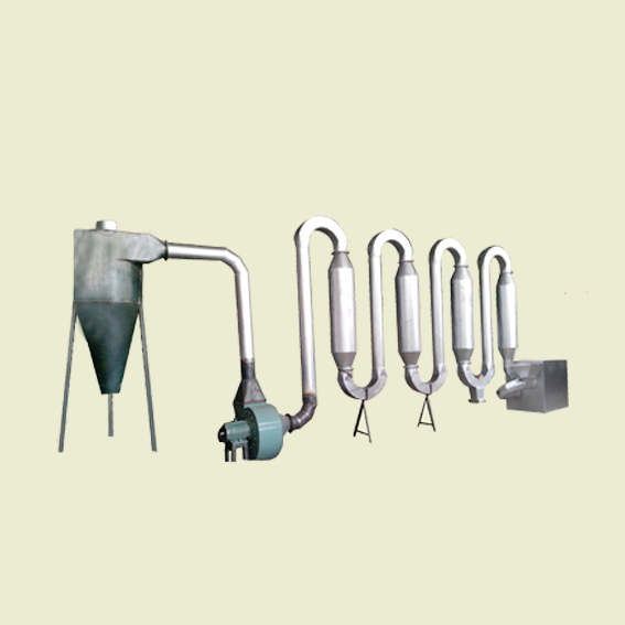 該機(jī)主要由熱風(fēng)爐、U型脈沖管、風(fēng)機(jī)、剎克隆等部分組成,在引風(fēng)機(jī)作用下熱風(fēng)和物料同時(shí)被吸入管道中。含水物料懸浮于高速熱氣流中,通過(guò)干燥管道。由于脈沖管作用,氣流發(fā)生旋轉(zhuǎn),使物料不斷翻滾,增大了與熱氣流的傳熱交換,提高了熱效率。物料在3-5秒時(shí)間內(nèi)即完成干燥,被旋風(fēng)分離器及袋式收集器收集?;厥招矢哌_(dá)98%,可連續(xù)干燥大量物料。